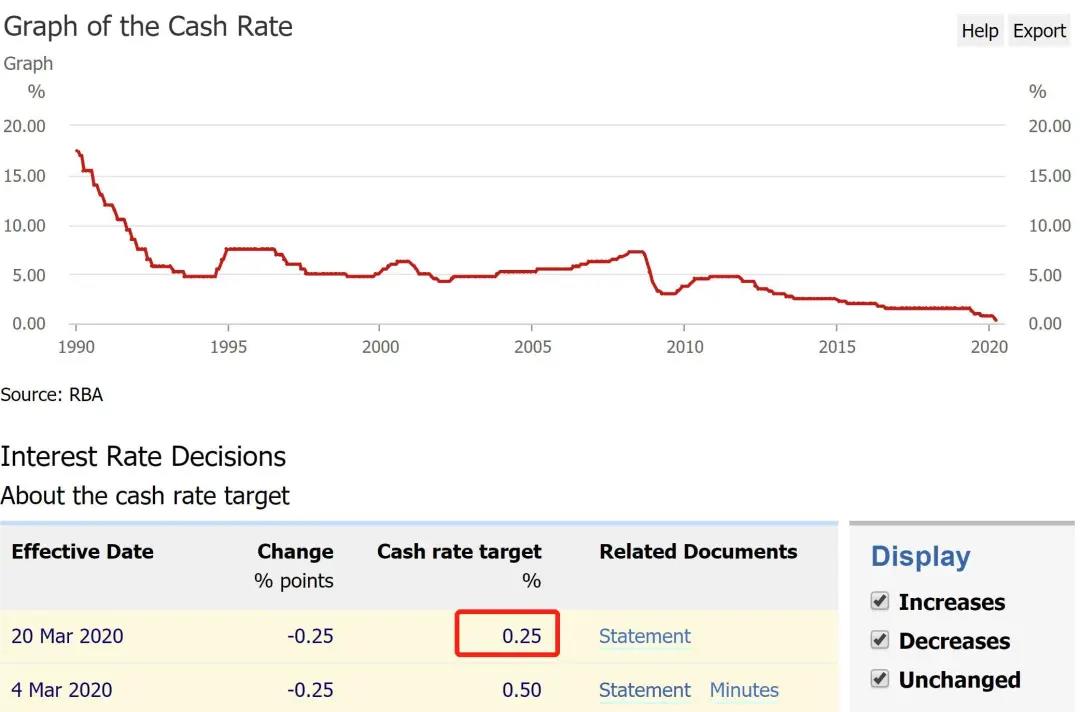 昨日,澳央行(RBA)緊急宣布再降息25個(gè)基點(diǎn)!至歷史最低點(diǎn)0.25%!3月20日生效。這是澳央行在3月4日降息25個(gè)基點(diǎn)至0.5%后,2020年的第二次降息。這也是去年6月至今,澳央行的第五次降息,再次刷新澳利率的歷史低點(diǎn)。