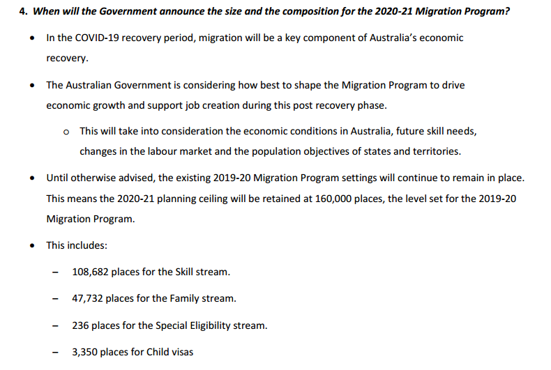 澳洲移民局同時(shí)公布了2020-2021財(cái)年澳洲移民計(jì)劃Q&A,針對(duì)大家關(guān)注的移民配額、州擔(dān)保發(fā)放、EOI邀請(qǐng)以及未來澳洲移民前景等相關(guān)問題一一作了解答。