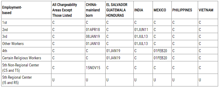 根據(jù)職業(yè)移民簽證排期表A,對(duì)于中國大陸出生的申請(qǐng)人,EB-1、EB-4類別繼續(xù)維持無排期狀態(tài);EB-2類別排期為2018年4月1日,前進(jìn)4個(gè)月;EB-3類別排期為2019年1月8日,前進(jìn)7天;EB-5直投類別排期為2015年11月15日,前進(jìn)7天;EB-5區(qū)域中心類別顯示“U”,因法案暫停暫無簽證名額可用。