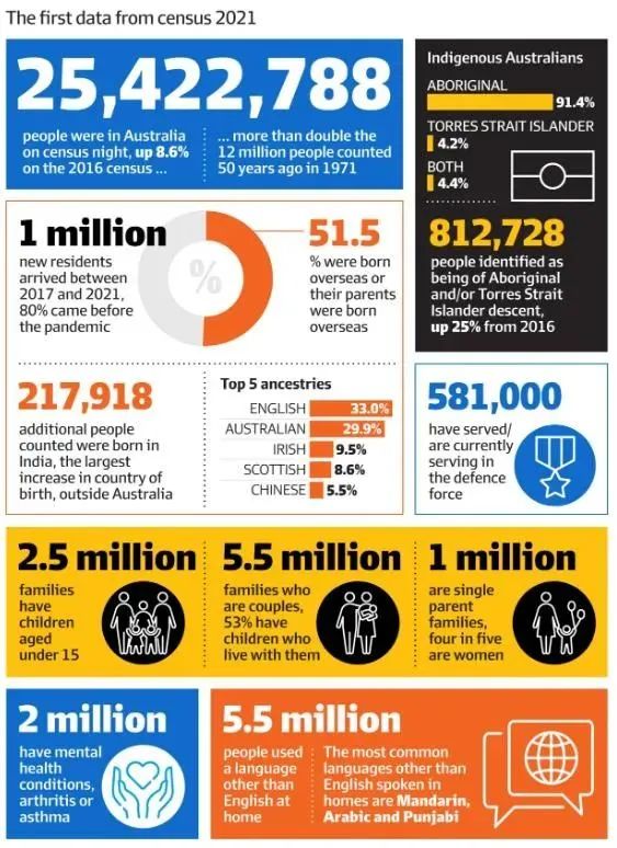 6月28日,澳洲統計局公布了2021年人口普查結果,涉及人口數量、各國移民數量等多個方面。