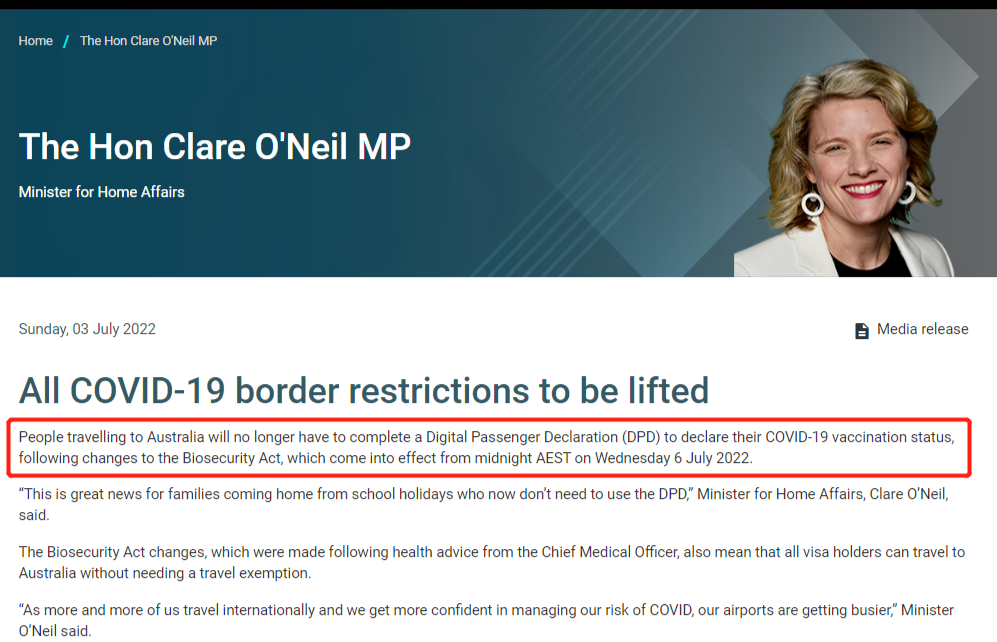 澳洲政府宣布:自2022年7月6日0時起,無論是留學生或者游客,所有的外國人入境澳洲不再需要申報疫苗注射情況,即使沒打過疫苗也可以順利入境。從此,入境澳洲無需疫苗,無需隔離!