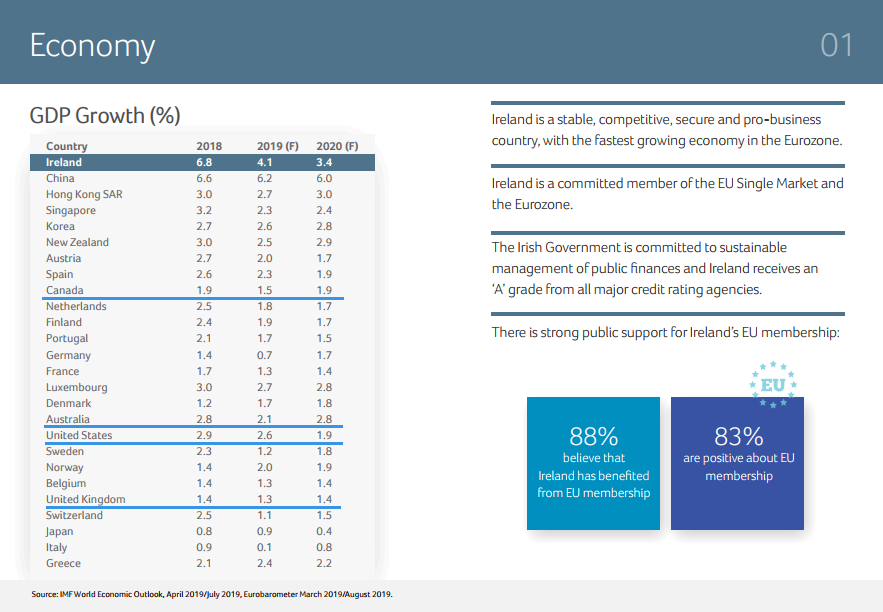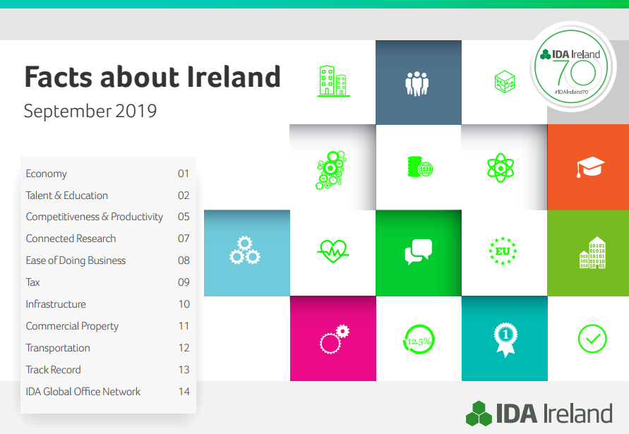 近日,愛爾蘭投資發(fā)展局(IDA)公布了2019年最新的Facts about Ireland。報(bào)告用清晰的數(shù)據(jù),呈現(xiàn)了愛爾蘭在經(jīng)濟(jì)、教育、全球競爭力、稅收等方面的全球排名和地位。