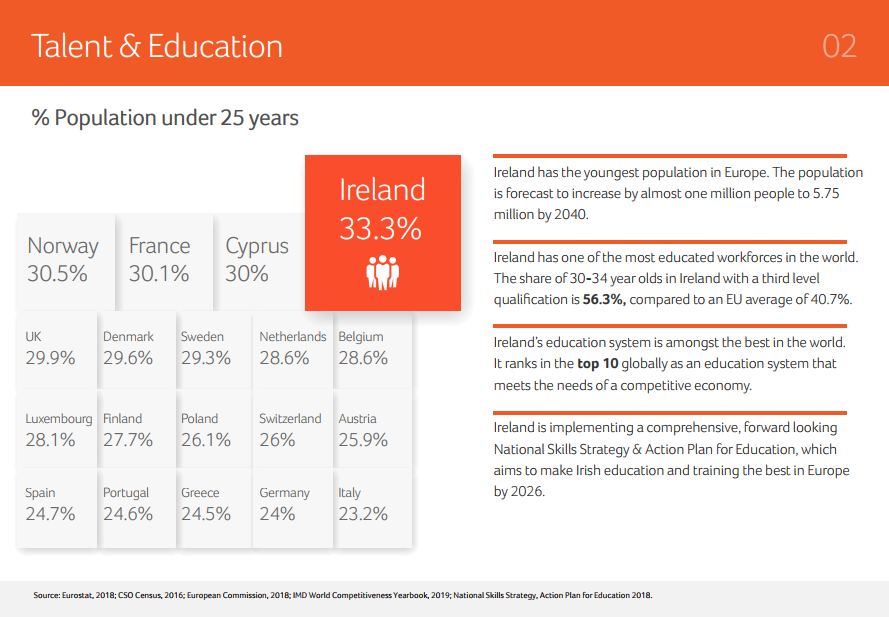 愛爾蘭的確擁有歐洲最年輕的人口,25歲以下群體占愛爾蘭人的1/3。愛爾蘭沿用英式教育,教育系統(tǒng)排名全球前十,近30%學(xué)生在科學(xué)、技術(shù)、工程和數(shù)學(xué)(STEM)領(lǐng)域深造。愛爾蘭30-34歲的年輕人中有56.3%接受了高等教育,位居歐洲第一。同時(shí),愛爾蘭在吸引和留住國際人才方面排名全球第一。