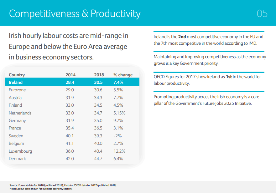 據(jù)IMD報(bào)告,愛爾蘭是歐盟第二大及全球第七大最具競爭力經(jīng)濟(jì)體。另據(jù)經(jīng)合組織(OECD)報(bào)告,愛爾蘭勞動(dòng)力被列為世界上生產(chǎn)效率最高的勞動(dòng)力。2011-2017年度IBM全球區(qū)域趨勢報(bào)告,愛爾蘭更是連續(xù)6年蟬聯(lián)“吸引全世界高價(jià)值項(xiàng)目投資”全球第一。