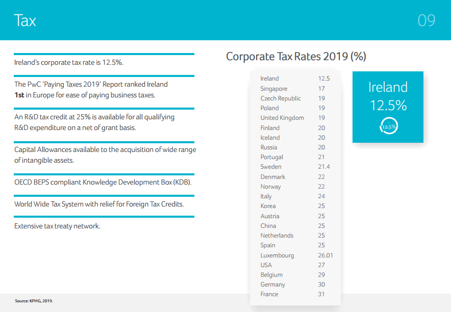 愛爾蘭企業(yè)稅率僅12.5%,據(jù)PwC發(fā)布的“Paying Taxes 2019”報(bào)告,愛爾蘭在企業(yè)稅收優(yōu)惠方面,排在歐洲首位。得益于愛爾蘭優(yōu)惠的稅收政策及利商的經(jīng)濟(jì)環(huán)境,在愛爾蘭投資的跨國公司中,有1/3企業(yè)已在愛爾蘭開展業(yè)務(wù)20余年。