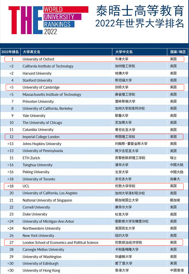 日前,2022年度泰晤士高等教育(THE)世界大學排名出爐,英國牛津大學連續第六年蟬聯榜首,劍橋大學與麻省理工學院并列全球第五,英國G5院校(牛津大學、劍橋大學、帝國理工學院、倫敦大學學院和倫敦政治經濟學院)全部排名世界前30。毫無疑問,英國高等教育水平始終位居世界頂尖之列。