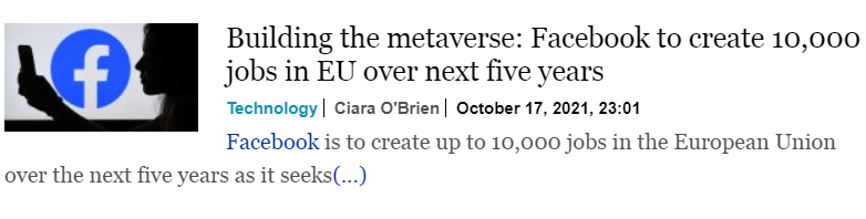 據《愛爾蘭時報》報道,未來五年內,美國社交媒體巨頭Facebook將在歐盟范圍內創造1萬個新的高技能工作崗位,以推動開發“元宇宙”(Metaverse),其中部分就業崗位將劃分給其位于愛爾蘭都柏林的歐洲總部。