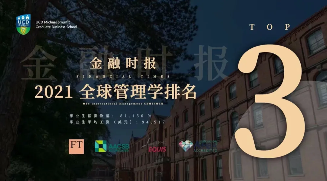 據英國《金融時報》公布的最新商學院排行榜,都柏林大學(UCD)Smurfit商學院的全日制國際管理碩士課程被評為全球第三佳課程,這是該專業連續第四年躋身全球前十,比去年的第八名又躍升了五位。