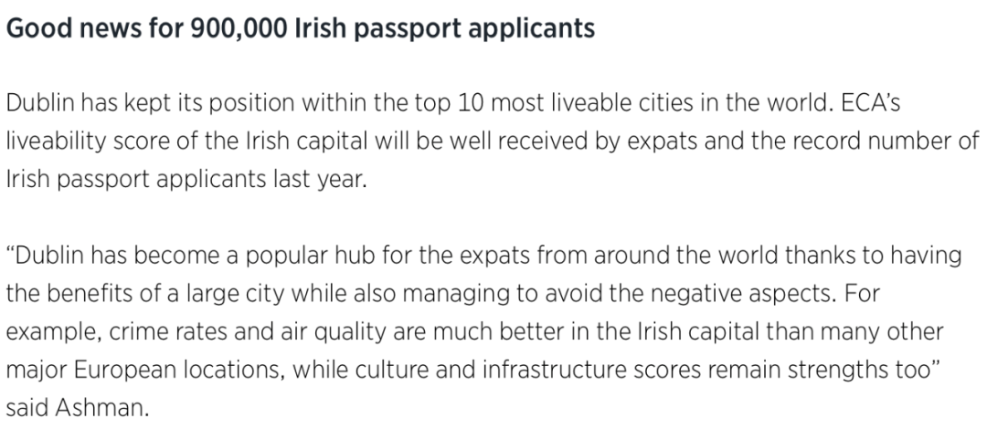 ECA國際分析師Neil Ashman表示:“對于來自世界各地的移民而言,都柏林已經成為一個備受歡迎的中心城市,其極低的犯罪率和極高的空氣質量遠遠優于其他歐洲主要城市,同時濃厚的文藝氛圍和優良的基礎設施配套也為它增分不少”。