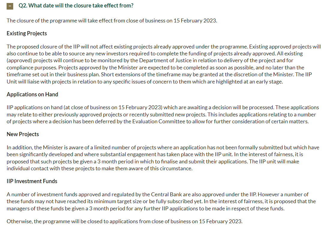 愛爾蘭IIP關(guān)停補充說明關(guān)鍵信息一覽: