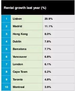 租金漲幅榜前十排名中,歐洲城市占據(jù)五個席位,葡萄牙的里斯本的住宅租金以20.9%的增速位居全球第一。西班牙馬德里以11.1%的增速位居第二位,巴塞羅那以7.7%的成績躋身前五,愛爾蘭都柏林位居第四。