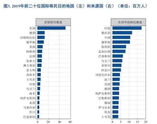 根據報告,印度仍是國際移民的最大來源國,居住于國外的印度移民人數為1750萬。其次是墨西哥和中國,分別為1180萬和1070萬。自1970年以來,美國一直是國際移民的主要目的地國,移民數量從當年的不足1200萬增至2019年的5070萬。其次是德國、沙特阿拉伯、俄羅斯和英國。