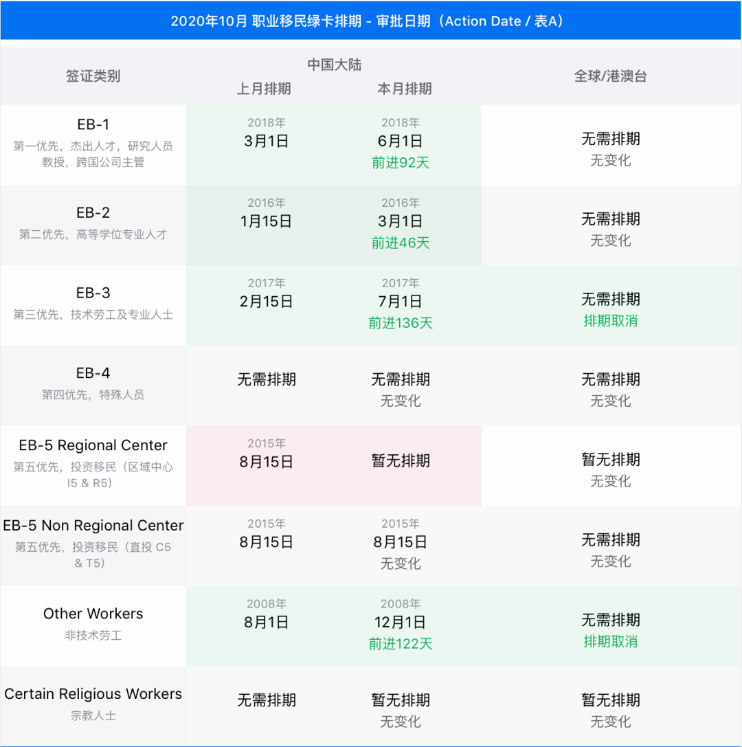 9月24日,美國國務院簽證辦公室,公布了2020年10月,也就是2021財年第一個月的簽證公告牌。
