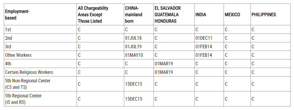 職業移民表A:EB-2前進7個月,EB-3前進4個月,EW-3(Other Workers,非技術移民)前進2個月,EB-5非區域中心前進54天。