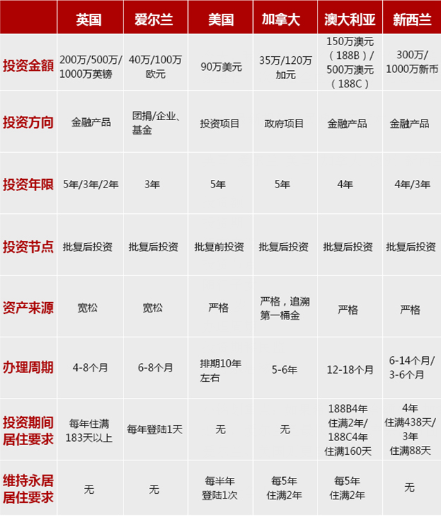 小銘劃重點:如果希望投資金額少,加拿大、美國在6國中相對更低,值得一提的是,澳洲188B投資移民今年7月起投資額將提升至250萬澳元起;如果希望投資款早日返還,愛爾蘭是最快的;資產來源方面,英國、愛爾蘭的審核相對寬松;而居住要求方面,愛爾蘭、美國則更自由。