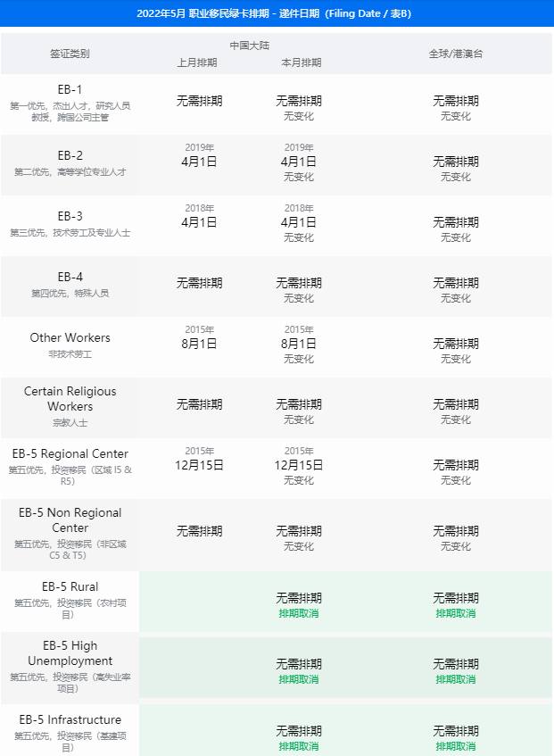 ·由于EB-5新政為三類項目(鄉村、高失業地區、基建)預留了簽證配額,他們成為排期表中的新成員,目前處于無排期狀態。