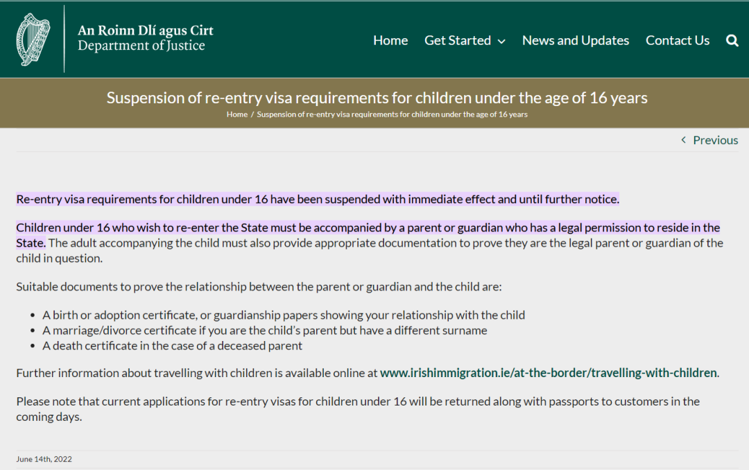 6月14日,愛爾蘭司法部門和移民局發(fā)布通知稱,取消對16歲以下兒童再次入境愛爾蘭的簽證要求,并表示該規(guī)定立即生效,直至進一步通知。
