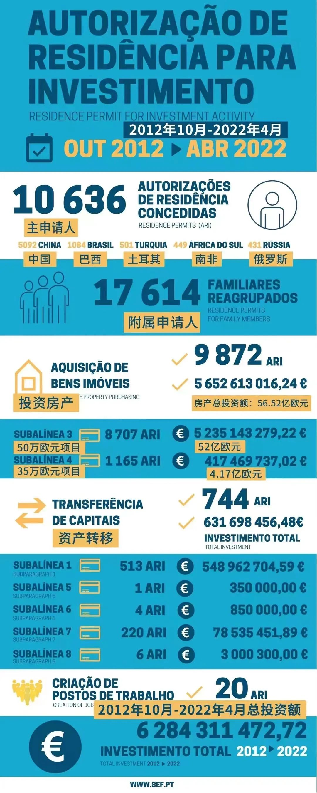 葡萄牙移民局(SEF)最新公布的黃金簽證數據顯示:2022年4月,共有121位主申請人和116位附屬申請人獲批葡萄牙黃金簽證,投資額為5975萬歐元。其中,來自美國的主申請人為26人,其次是中國(15人)、土耳其(13人)、印度(11人)、巴西(8人)。