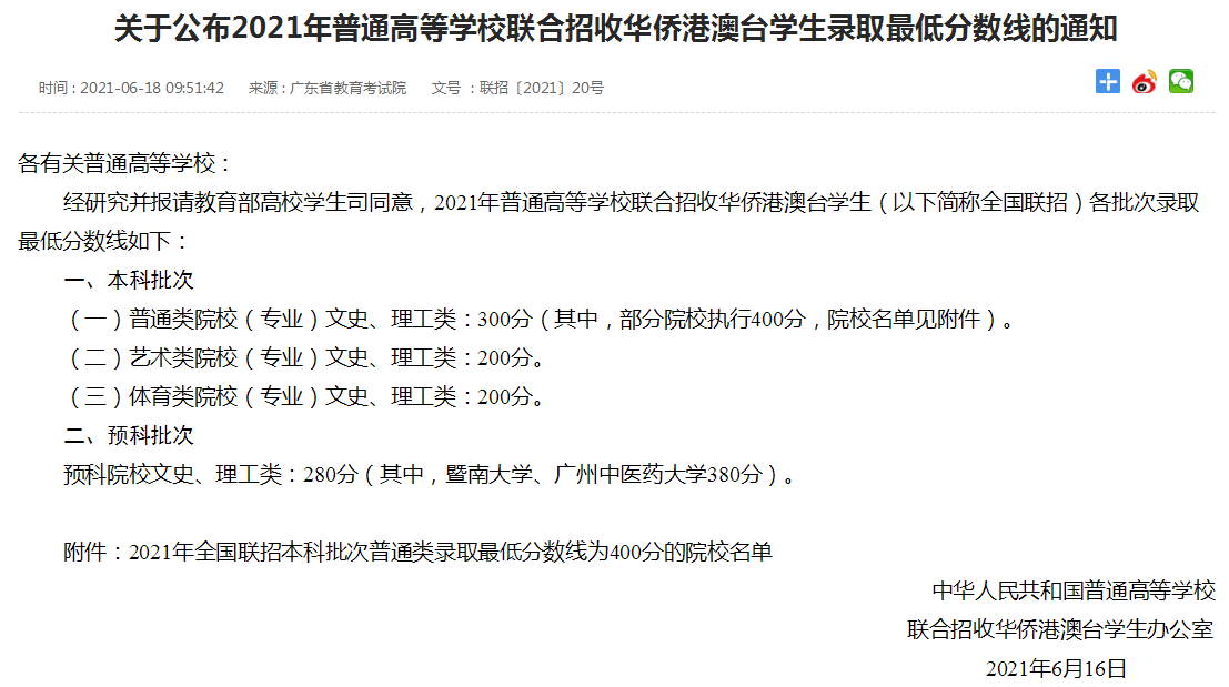 預科院校文史、理工類:280分(其中,暨南大學、廣州中醫藥大學380分)。