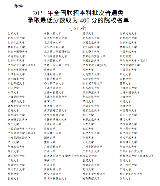 2021年全國聯招本科批次普通類錄取最低分數線為400分的院校名單: