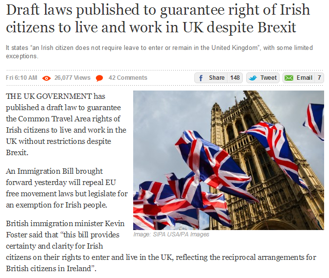 3月5日,英國發布一項移民法案(草案),廢除歐盟的自由流動法,但對歐盟國愛爾蘭除外。該法案再次重申,英國脫歐后,愛爾蘭公民依然可享受在英國自由定居、生活的共同旅游區(CTA)特權。而其他歐盟國公民,則需另行申請英國居留簽證才可定居英國。