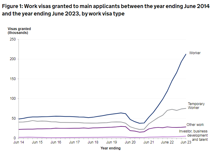 英國內政部的官方數據顯示:在截至今年6月的一年里,英國發放了近54萬份工作簽證(包括家屬在內)。相比2022年同期大增63%,工作簽證一躍成為全球移英家庭的“新寵”。